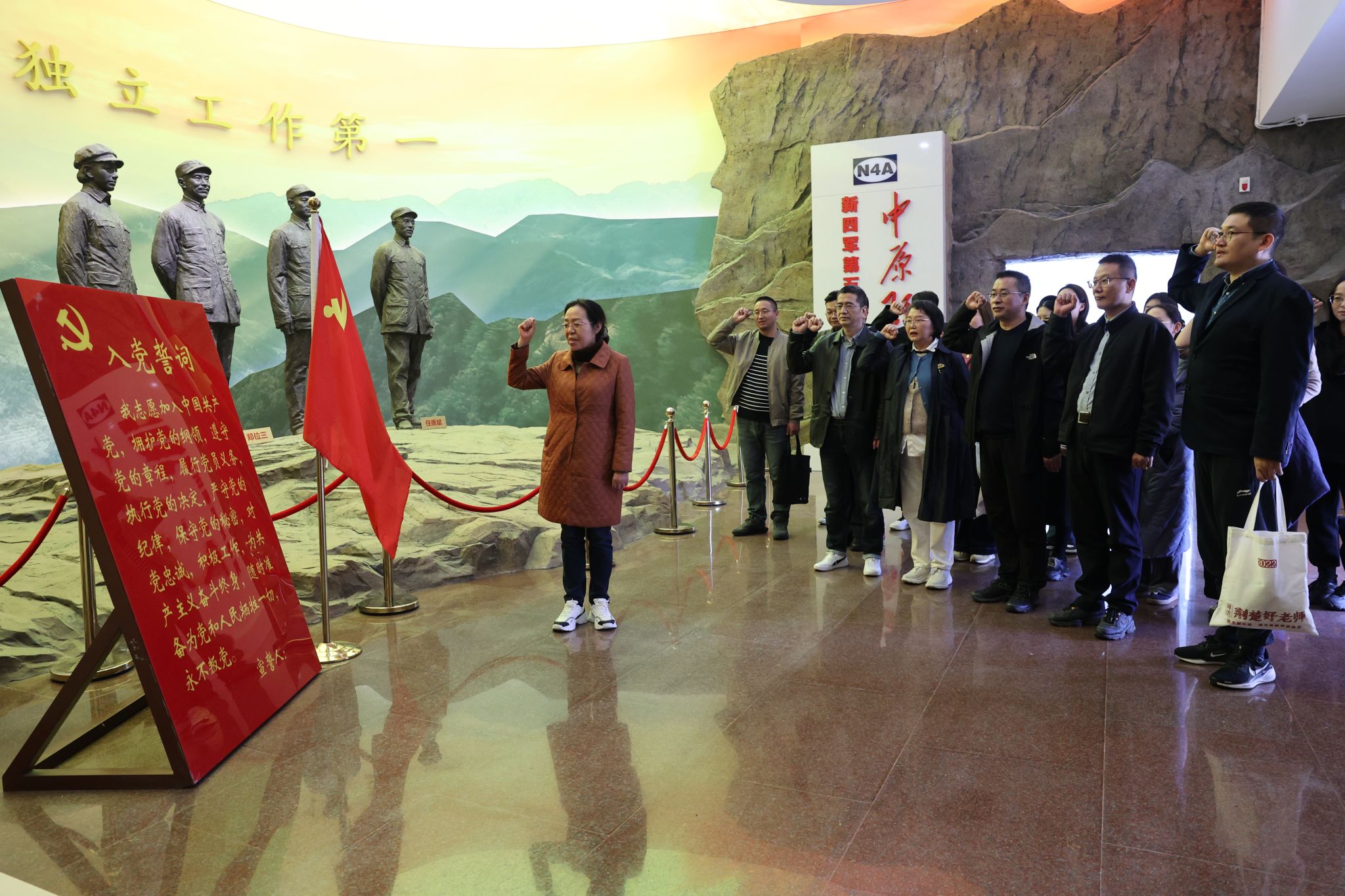 作为鄂豫皖抗日民主根据地的核心地带,位于大悟县芳畈镇白果树湾的新四军第五师司令部旧址青砖灰瓦、古朴庄重,无声诉说着烽火岁月的峥嵘历史,更承载着弥足珍贵的大别山精神。在新四军第五师纪念馆内,在庄严肃穆的革命先烈浮雕前,由马克思主义学院高翔莲同志领誓,支部党员整齐列队、高举右拳,字字铿锵地重温入党誓词:“我志愿加入中国共产党,拥护党的纲领,遵守党的章程……”激昂的誓言回荡在纪念馆内,也激荡在每一位党员的心中。纪念馆里,一幅幅历史图片、一件件战时实物、一个个动人故事,讲述着老一辈革命家指挥抗日、发动群众、创建根据地的壮阔历程。支部党员从先辈们的坚守中领悟到“坚定信念、胸怀全局、团结奋进、勇当先锋”大别山精神的核心内涵。