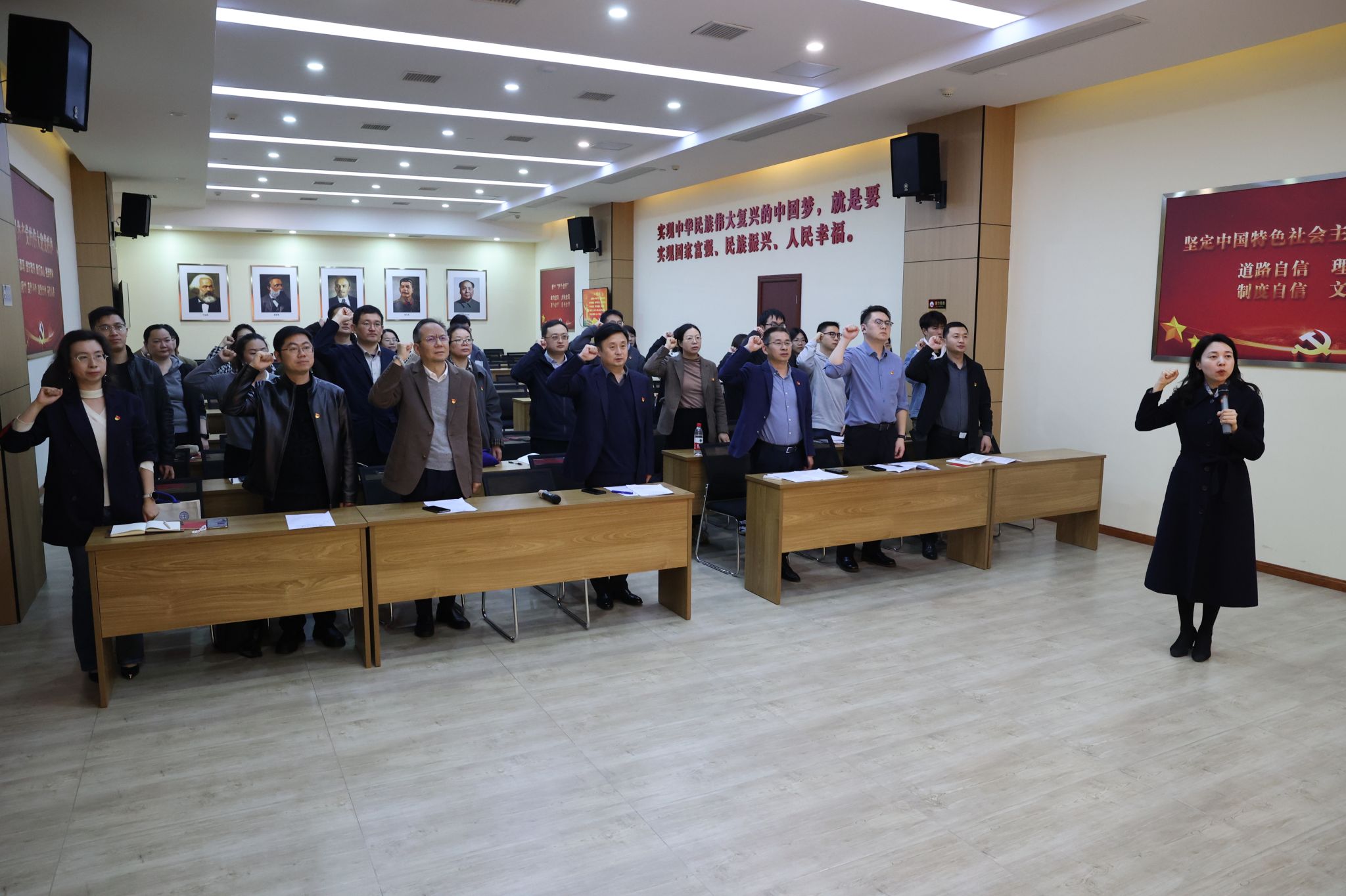 全体党员高举右拳,重温入党誓词,领读党章。