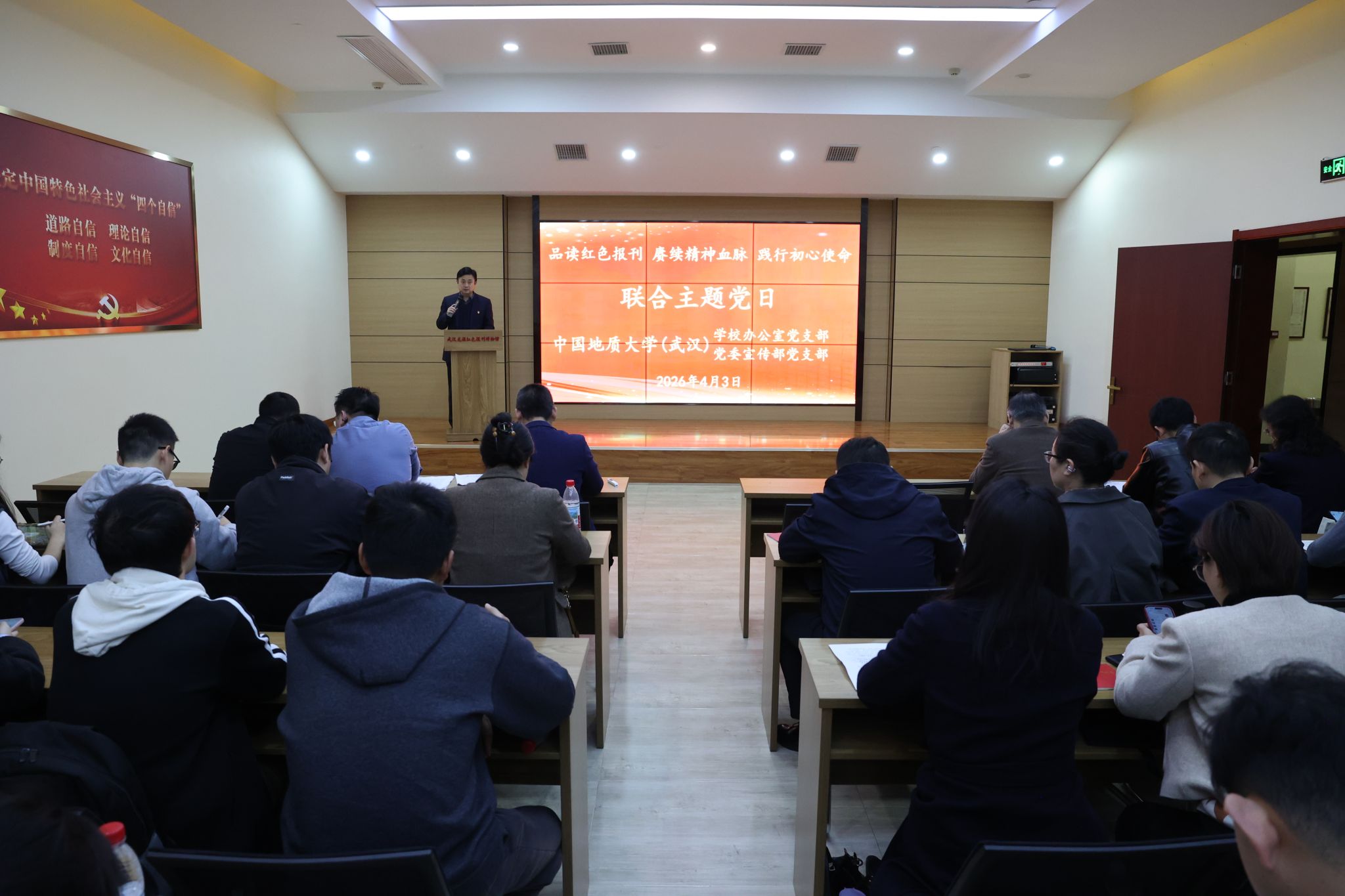 (记者 高雅)为深入学习贯彻全国两会精神,扎实开展树立和践行正确政绩观学习教育,推动党建与业务深度融合,4月3日,宣传部党支部、学校办公室党支部联合赴武汉龙源红色报刊博物馆开展主题党日活动。两支部党员、沉积储层党支部、山海求知党支部学生党员代表及结对领航班级代表共同参加主题党日活动。